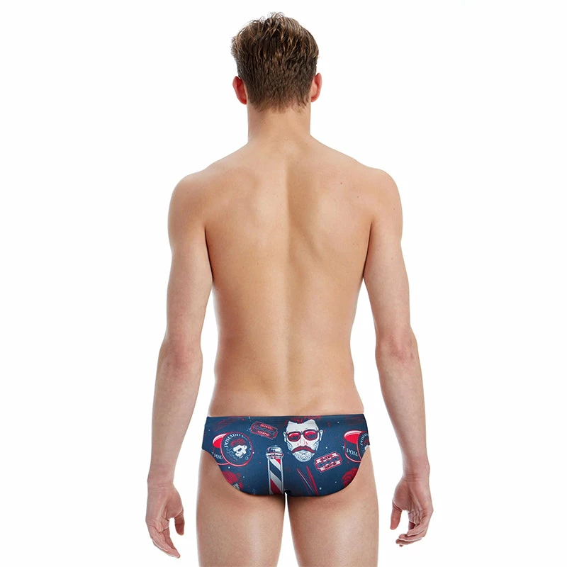 Hey, bad boy! Are you on the hunt for a cool style? You’re going to flip for the AMANZI Barber Chop briefs. These bold 7cm briefs feature a hip barber style print in bold shades of cherry red and cream. With pomade, a comb, razor, and a bearded barber, this swimsuit has everything that you need to look smokin’ hot!