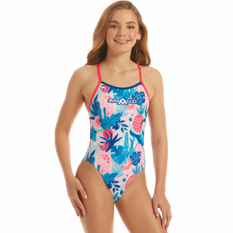 Pair the pretty pink, electric red and navy blue Kalani One Piece perfectly with the sun, sand and a pineapple in hand. Featuring a tropical design scattered with palms, pineapples and some cacti to keep you looking sharp, the Kalani will have you finding adventure wherever you go.