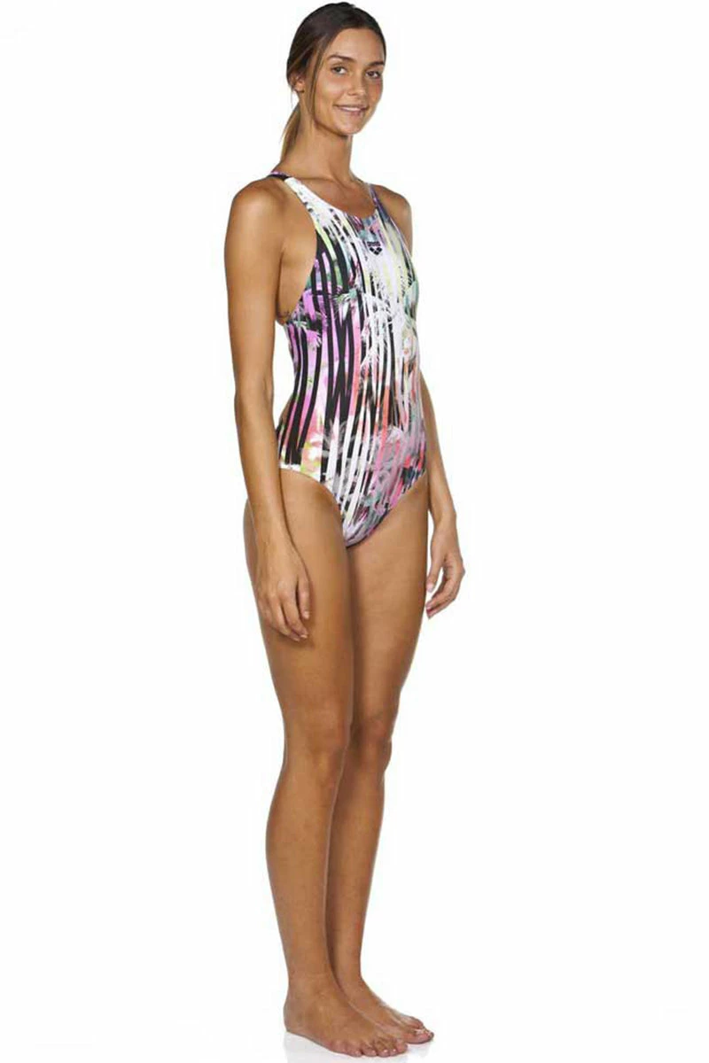 The arena One Riviera One-piece is made with a single piece of fabric without any side seams. This new, more hydrodynamic design improves glide and freedom of movement. Printed front and back with a palm tree motif in alternating shades, we love the summer spirit of this high-tech suit. Wear yours for training and intensive swimming.