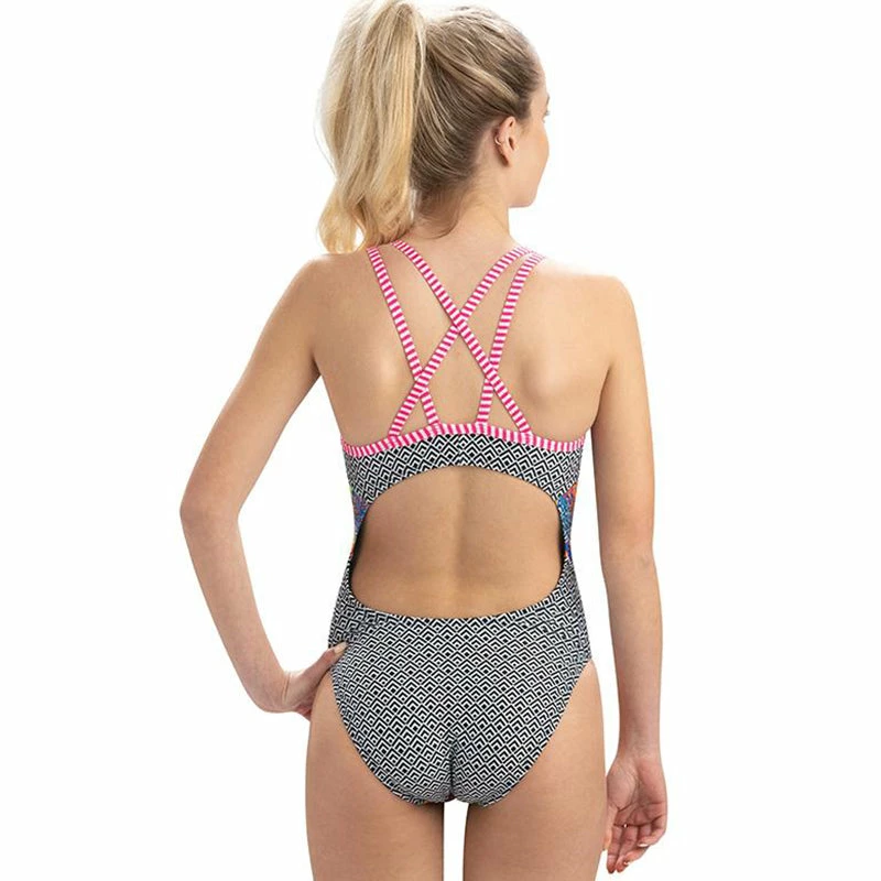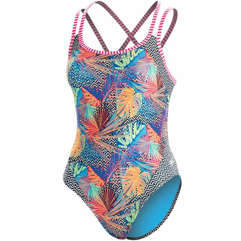 Bring the beauty of the tropics with its adundant animal and lush plant life to the pool this season with the Womens Uglies Hyper Tropic Double Strap Open Keyhole Back One Piece swimsuit.