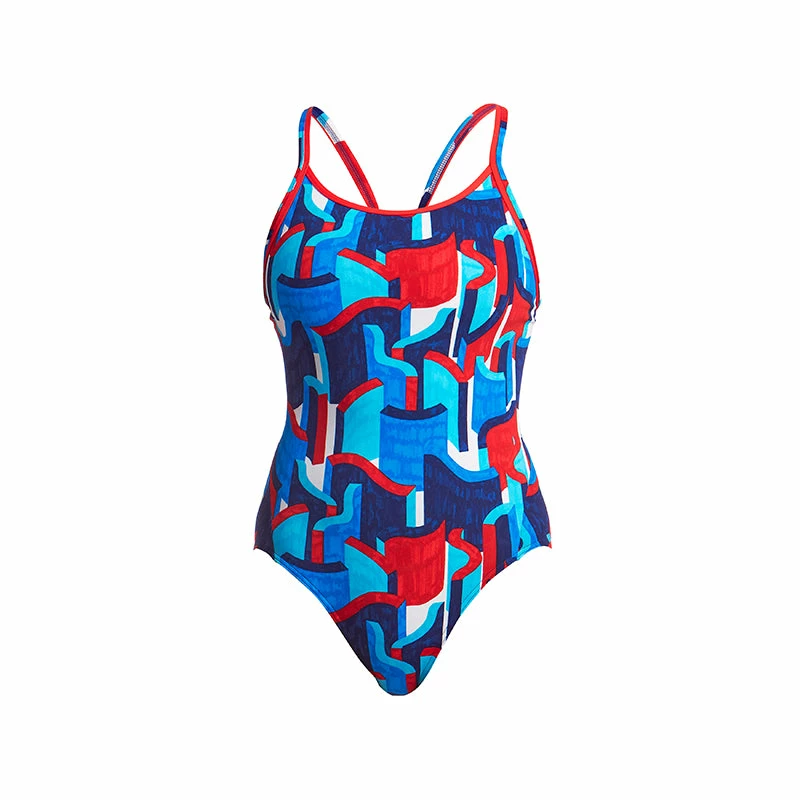 Our classic training style with signature diamond back strap finish and modest rear coverage is perfect for lap sessions. Features a circular cut-out back. With front lining and Funkita embroidery, this easy style says it all.