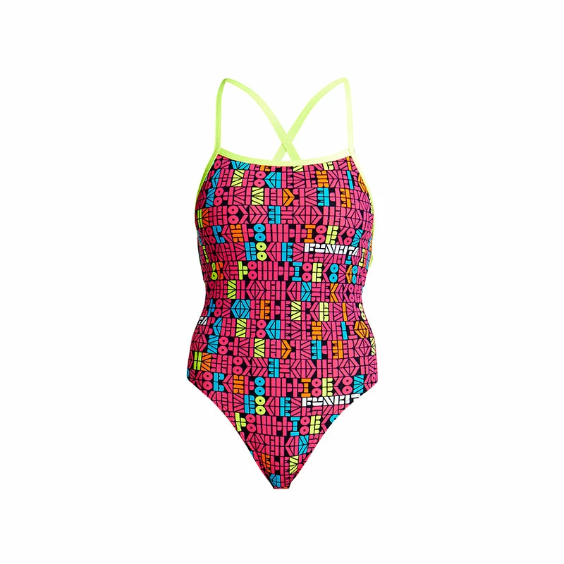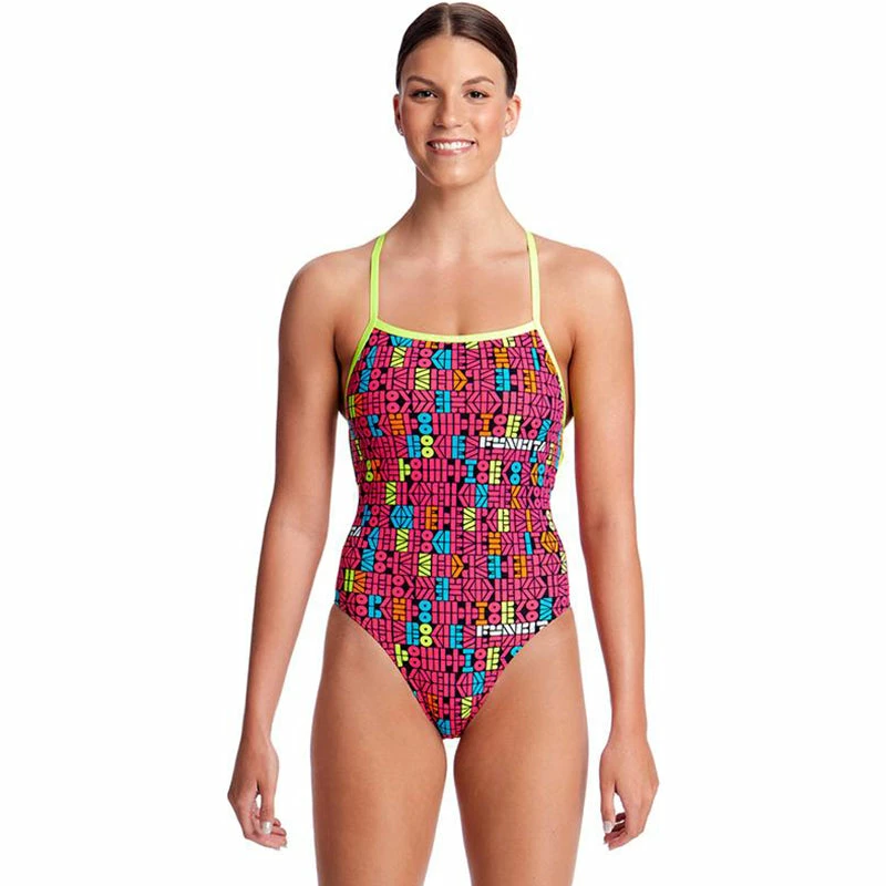 You’ll be sure to get noticed on pool deck in our strappiest one piece yet! Single strap binds that criss cross down your back with a moderately high cut leg and full front lining.Â
