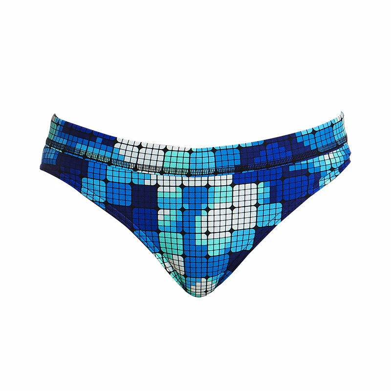 Hipster sports brief with drawcord and flat elastic waistband. Moderate leg rise and rear coverage. Sold as separates.