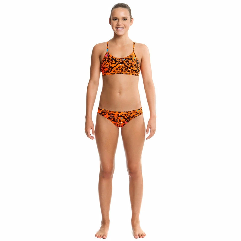 A firm fitting crop top and hipster brief suited to the sporty girl, with underbust and waist elastic and drawcord in the brief. Features single bind shoulder straps.