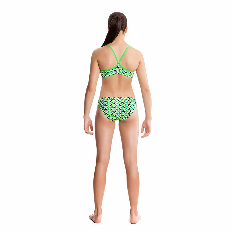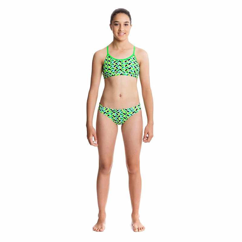 Firm fitting sports crop top with racer back and double strap bind finish. Hipster sports brief with drawstring and flat elastic waistband. Moderate leg rise and rear coverage. Made from C-Infinity, a colour intense chlorine resistant Polyester exclusive to Funkita and Funky Trunks. Single front Polyester lining.
