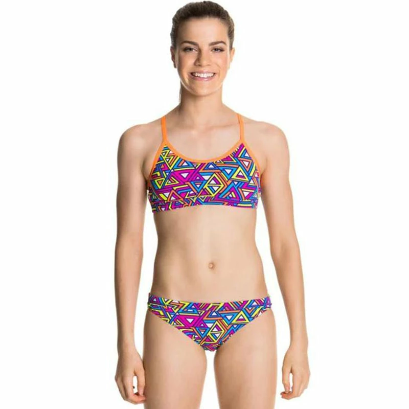 A firm fitting crop top and hipster brief suited to the sporty girl. Its a secure fit with underbust and waist elastic and drawcord in the brief. Features a single shoulder bind strap finish. Available in sizes 8 – 14.