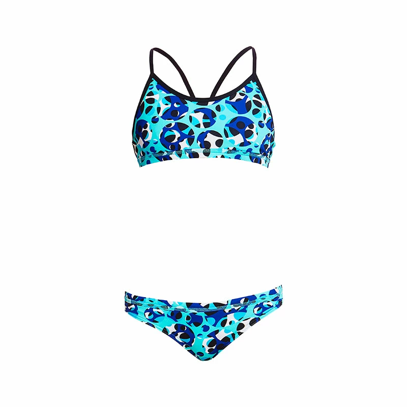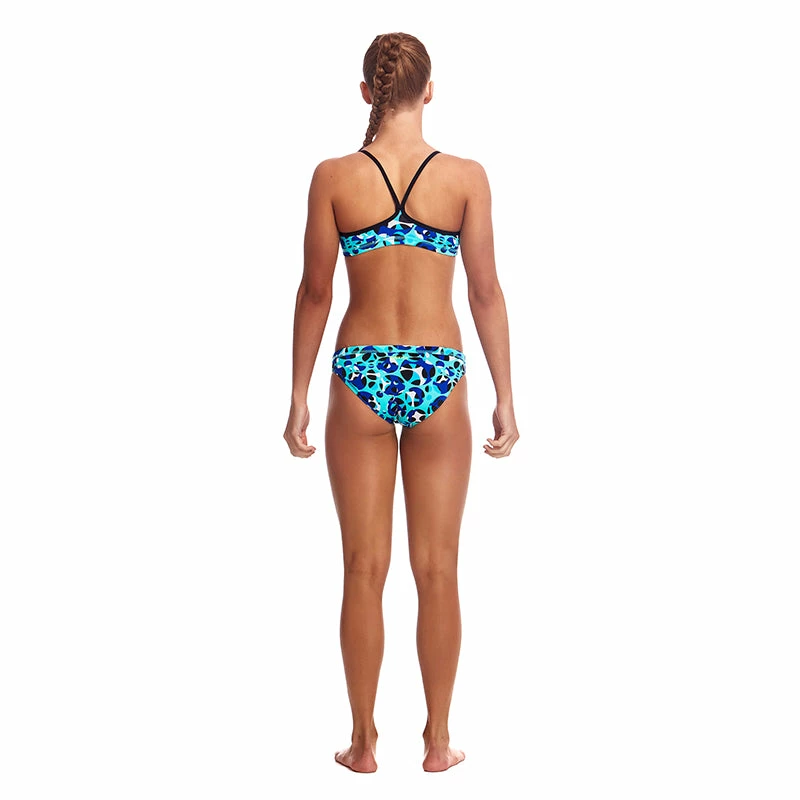 A firm fitting crop top and hipster brief suited to the sporty girl. Its a secure fit with underbust and waist elastic and drawcord in the brief. Features a single shoulder bind strap finish.
