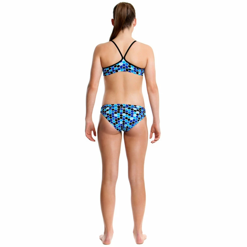 A firm fitting crop top and hipster brief suited to the sporty girl, with underbust and waist elastic and drawcord in the brief. Features single bind shoulder straps.