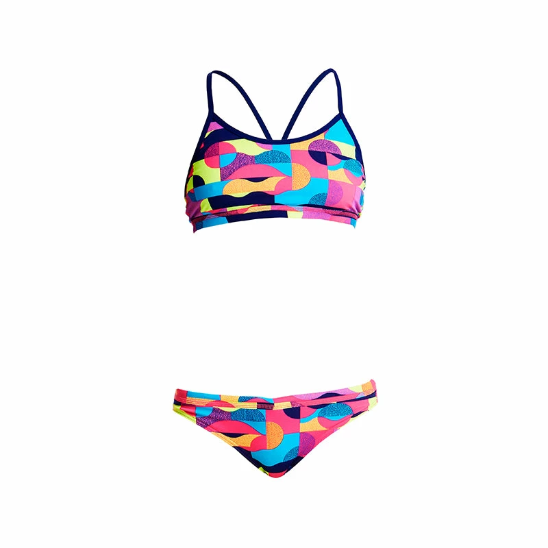 A firm fitting crop top and hipster brief suited to the sporty girl. It’s a secure fit with underbust and waist elastic and drawcord in the brief. Features a single shoulder bind strap finish.
