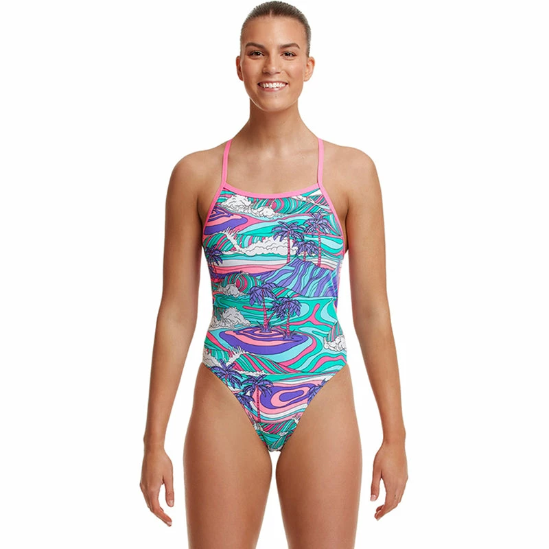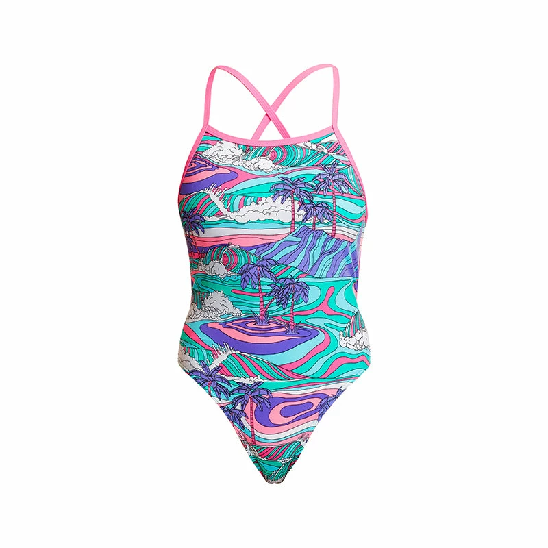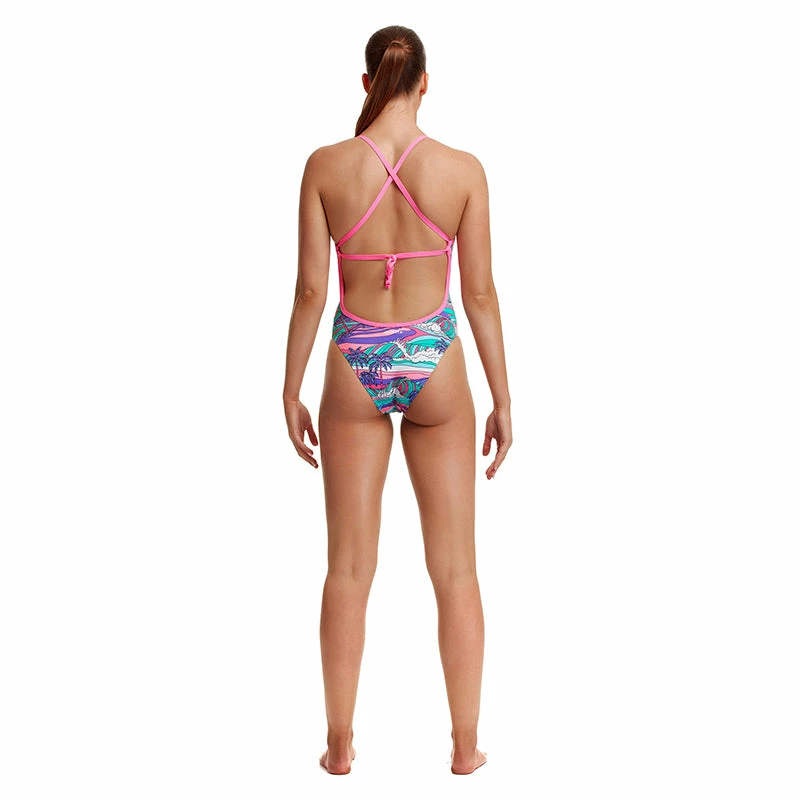 The one piece style that criss crosses down your back offering you the flexibility to tie it just the way you like. With a moderately high cut leg it’s the perfect style to strap in for a hard session in the pool or relax when you’re poolside.