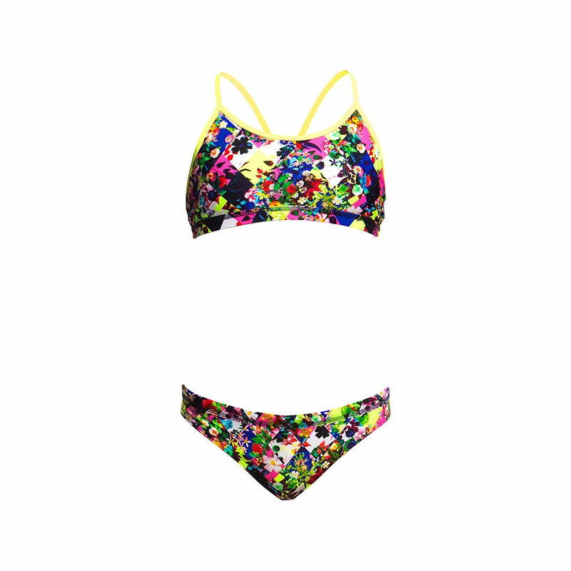 A firm fitting crop top and hipster brief suited to the sporty girl. Its a secure fit with underbust and waist elastic and drawcord in the brief. Features a single shoulder bind strap finish.