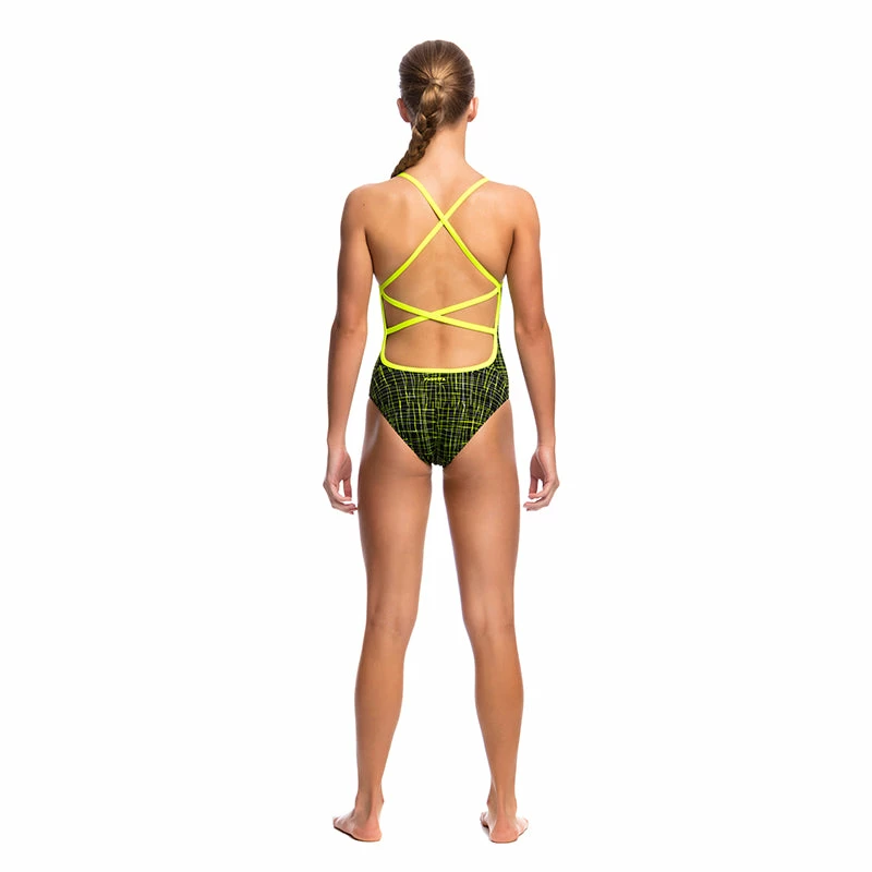 You’ll be sure to get noticed on pool deck in our strappiest one piece yet! Single strap binds that criss cross down your back with a moderately high cut leg.