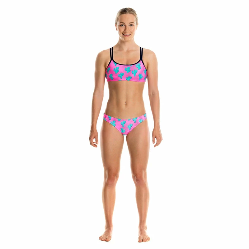 A double strap crossover back that provides added comfort and support for hours in the pool. Pairs back with the new skinny brief which provides firm rear coverage with drawcord. Available in sizes 8-14.