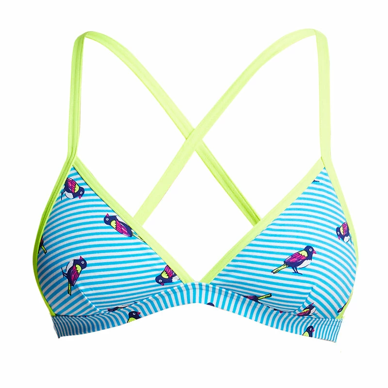 A fun triangular bikini top with adjustable single straps, crossing over at the back. Features a triangle shaped cup area with a single strap bind and narrow underbust elastic, suitable for A-C cups. Sold as separates.