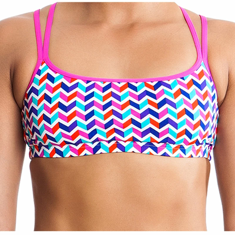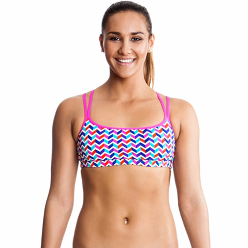 A double strap crossover back with flat underbust elastic that provides added comfort and support for hours in the pool. Sold as separates and available in sizes 8 – 14.