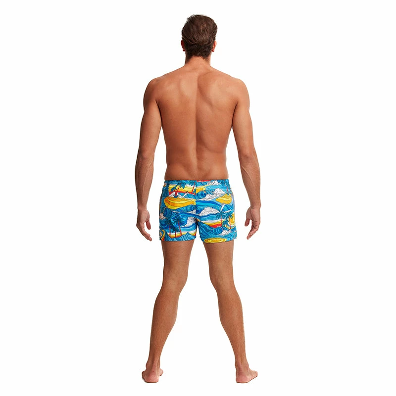 Short and stylish fitted watershort made of quick drying polyester. Features a built-in brief for added support, deep side pockets, coin pocket and drawcord to fasten. Now with Funky Trunks branded brass hardware including metal tips, eyelets and rivets. Funky Trunks patch on leg. Inseam length is 8.5cm. 90% Polyester 10% Elastane.