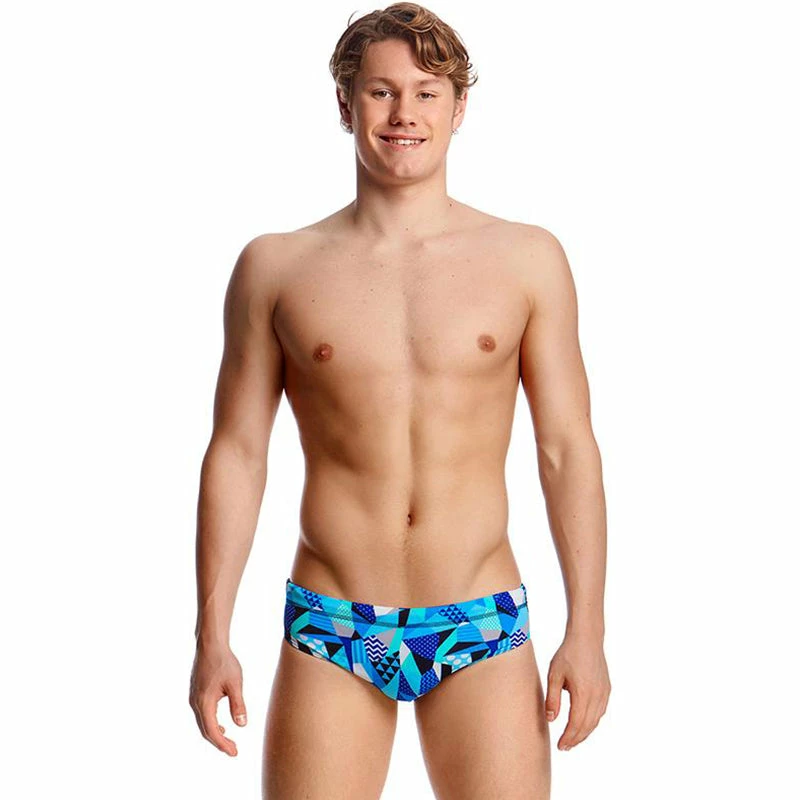 A classic cut brief with 8cm sides and flat elastic waistband and flatlock stitch finish. Drawcord, front lining and Funky Trunks embroidery come standard.