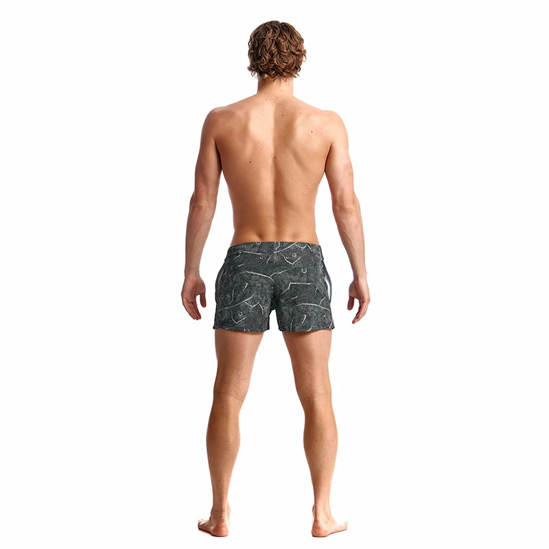 Short and stylish fitted watershort made of quick drying polyester. Features a built-in brief for added support, deep side pockets, coin pocket and drawcord to fasten. Now with Funky Trunks branded brass hardware including metal tips, eyelets and rivets. Funky Trunks patch on leg. Inseam length is 8.5cm. Available in sizes XSÂ – XXL. 90% Polyester 10% Elastane.