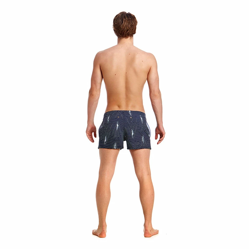 Short and stylish fitted watershort made of quick drying polyester. Features a built-in brief for added support, deep side pockets, coin pocket and drawcord to fasten. Now with Funky Trunks branded brass hardware including metal tips, eyelets and rivets. Funky Trunks patch on leg. Inseam length is 8.5cm. 90% Polyester 10% Elastane.