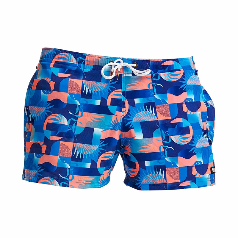 Short and stylish fitted watershort made of quick drying polyester. Features a built-in brief for added support, deep side pockets, coin pocket and drawcord to fasten. Now with Funky Trunks branded brass hardware including metal tips, eyelets and rivets. Funky Trunks patch on leg. Inseam length is 8.5cm. 90% Polyester 10% Elastane.