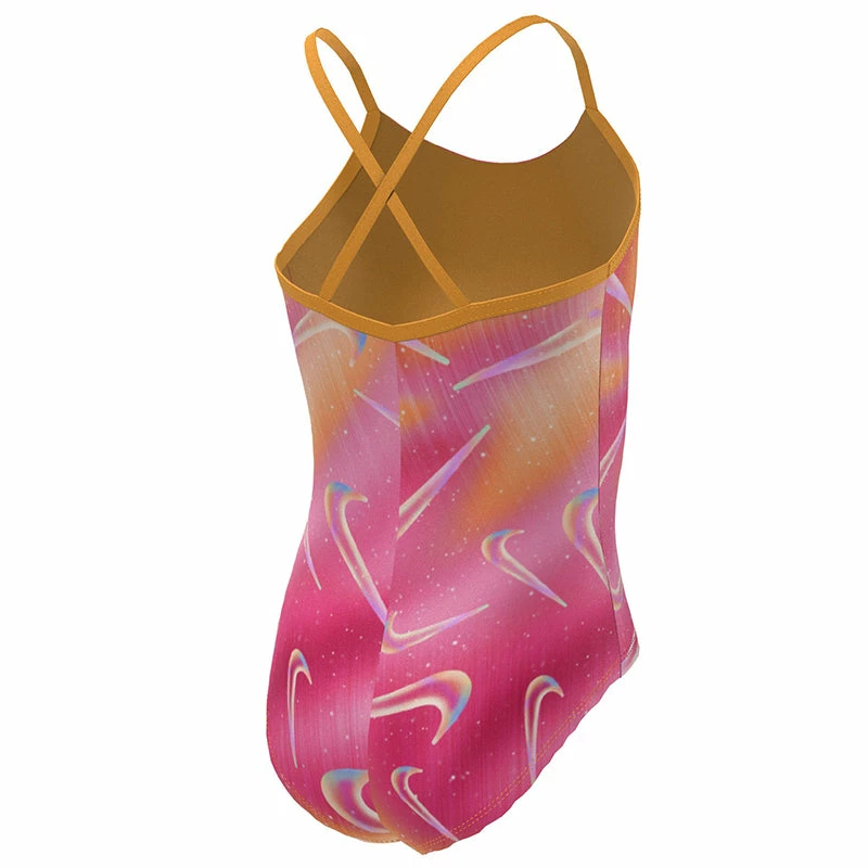 Harness the power of the northern lights in this sporty one piece from Nike. With its colorful space print and ergonomic enhanced fit, this suit is designed with the young athlete in mind. The crossback design for freedom of movement and standard bottom coverage are great on the beach or at the swim meet. Thanks to soft tricot fabrication, this is athletic swimwear that’s comfortable enough for long days of training and competition. (NESSD763)