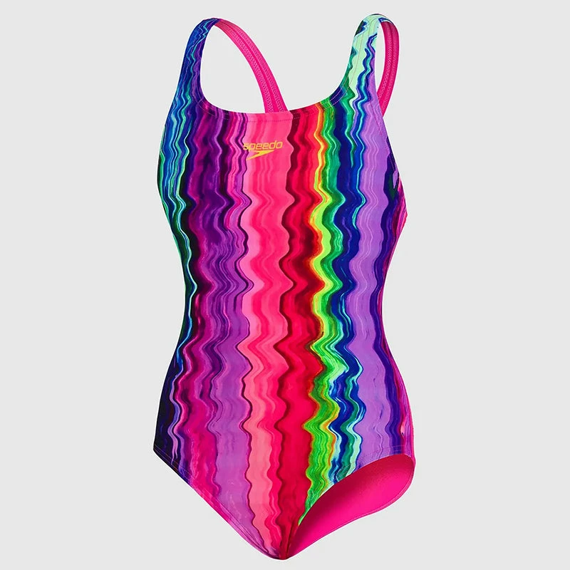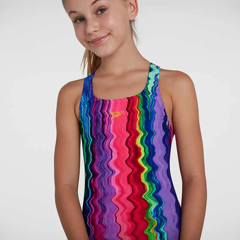 Feel confident in training wearing this eye-catching Medalist suit. Our popular medalist style features back straps that sit between the shoulders of young swimmers, aiding their movement and flexibility. Ideal for swim lessons and training, it’s made from our super-durable and 100% chlorine resistant Endurance+ fabric. (812520F991)