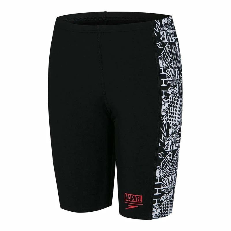 Bring a little comic to the pool with the Speedo x Marvel. A hit with kids for training and lessons, this stylish Jammer features a stylish black and white Marvel design on the leg panel. The drawstring waist and internal front lining provide a secure fit during training, while the 100% chlorine-resistant Endurance+ fabric ensures it lasts. With 4-way stretch technology and quick drying, young swimmers will feel comfortable in and out of the pool. (809531F326)