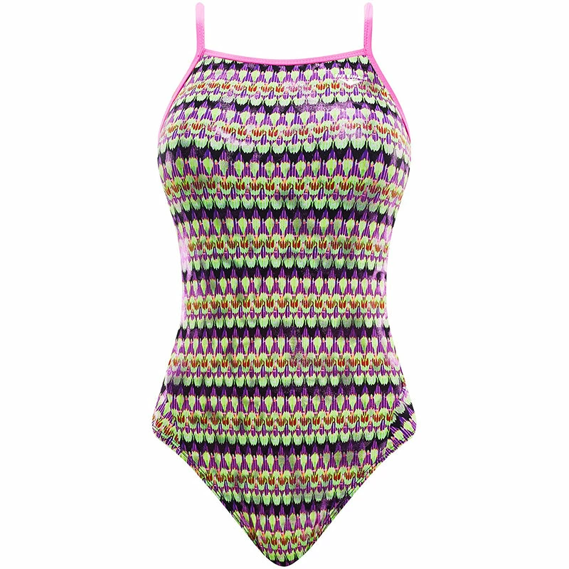 Featuring a wingback design, the 7918A offers minimal side and hip coverage without sacrificing support or comfort. Thin straps, a high cut leg and full lining make this Funnies swimsuit a trendy alternative for training, as well as an ideal choice for swim teams, clubs and competitive swimmers who want style with an edge.