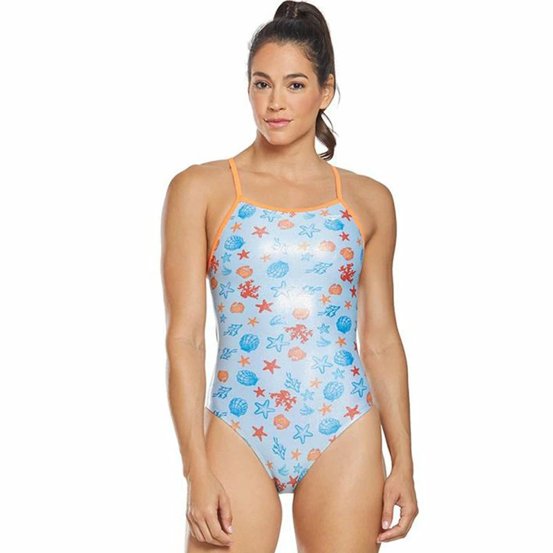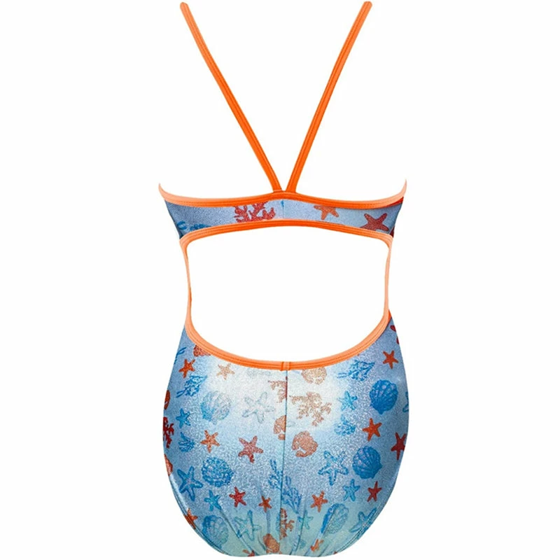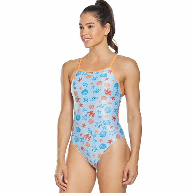 The Women’s Under the Sea Foil Funnies Flutterback Swimsuit utilizes a sleek poly/spandex fabrication with a shiny foil finish to provide performance in and out of the water.