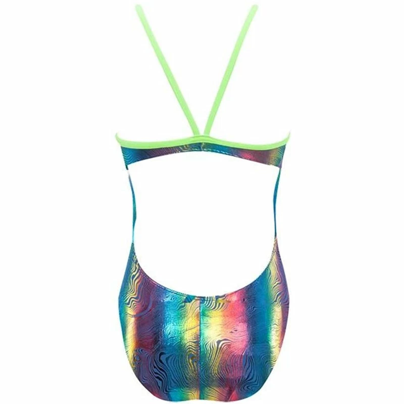 Wishing Tree Foil Funnies Wing Back Swimsuit utilizes sleek Poly/Spandex fabrication with a shiny foil finish to provide performance in and out of the water.